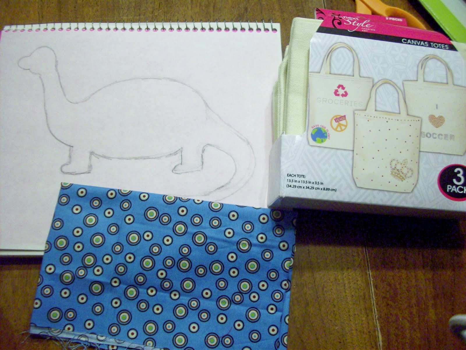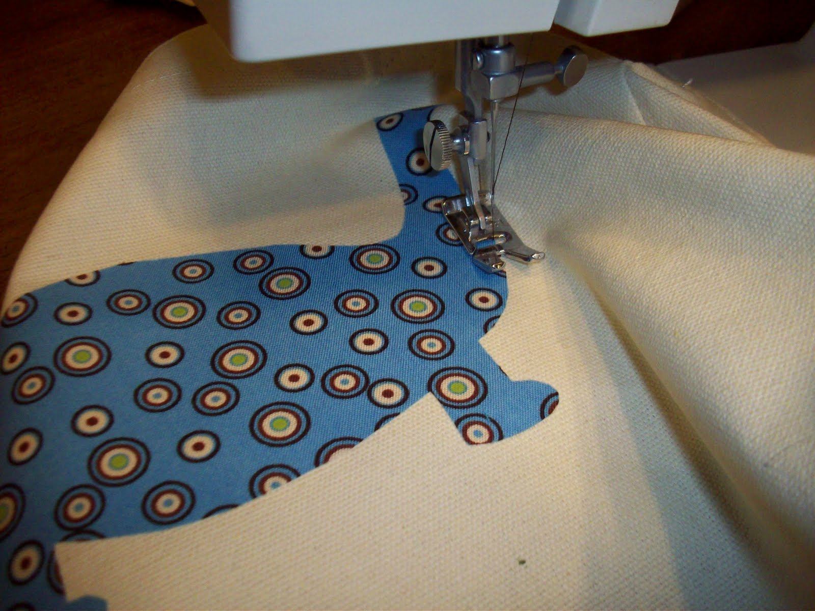 Draw your image on the paper side of the heat n' bond, cut it out- but not right on the line. Follow package directions to fuse the image to the wrong side of the fabric. Then cut it out.Again follow the package directions and fuse the image onto the canvas tote. Using your sewing machine (you could hand stitch this) stitch around the image. I find it easier to shorten the stitch length so I get a smoother line on curves and things. And go slowly, even slow on a machine is faster than by hand!