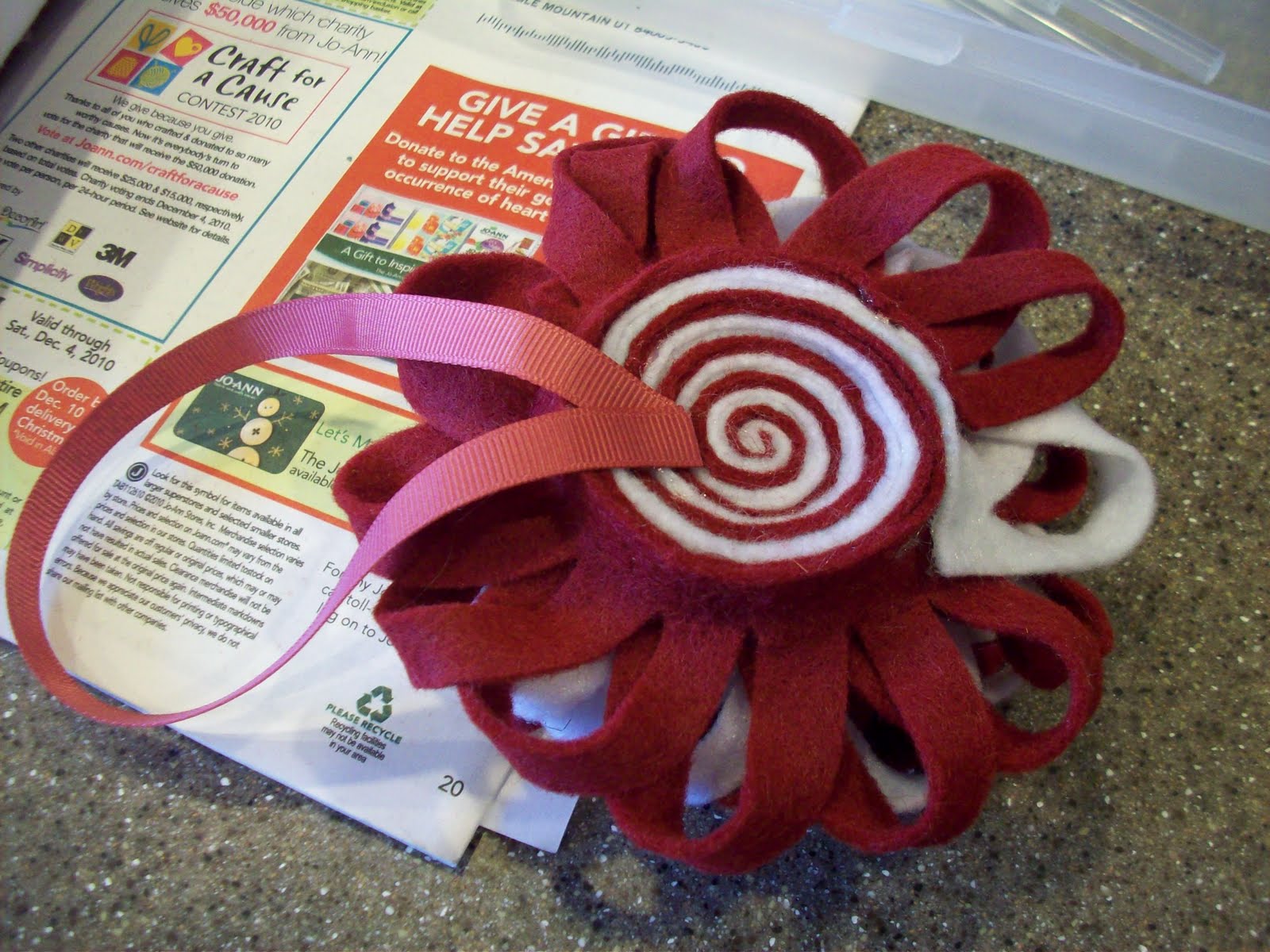 If you're making a flower, you're done, I just cut a circle of felt to cover the bottom and put a generous layer of glue on the bottom. If you're making an ornament, you will need to make a second "flower". Then, take a ribbon and glue the ends to one half. Put a bunch of glue and press the two halves together. Fluff the "petals" and you're finished.