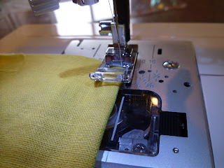 Fold on your marked line and sew as close as you can to the edge. I moved my needle to the right as far as I could and lined my fabric up about 1/8" in, it's probably a 1/16" seam allowance. {let's call it an educated guess. ;)}