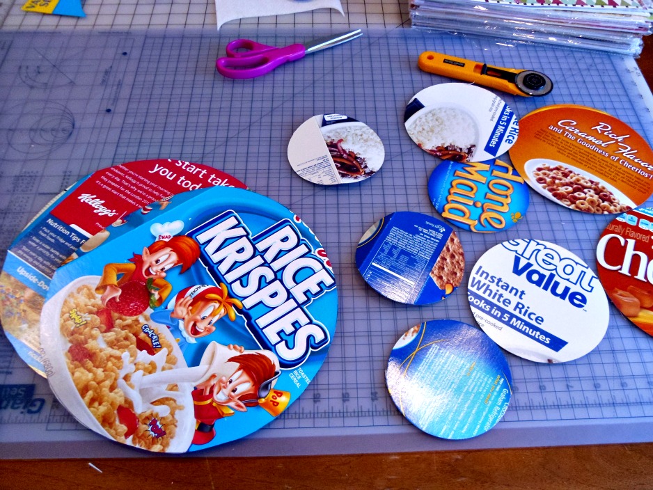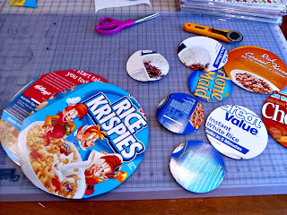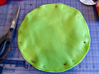 I have just two tutorial pictures.  The rest I think you can handle on your own.  First, I cut out various sized circles out of boxes.  This gives the ornaments some stiffness.  Second, I traced the circles onto a double layer of felt and cut them out.  *Two bits of advice: Pin, pin, pin.  I know I typed it three times, but it's just the first bit of advice. ;)  The second is, don't do what I'm illustrating and cut the felt larger, once you've traced the circle onto the felt, cut your cardboard template just a bit smaller so it won't show through the sides.