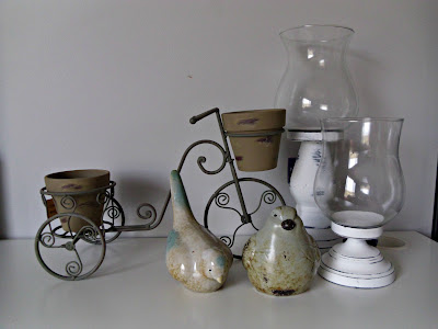 However, as I said, I was on the hunt for accessories to put around my house. I like a modern cottage feel, casual but not too busy. I love small accessories for the warmth and charm they give a home, but I don't want it to be crazy with millions of them. These are the treasures I found for my home. I love the white pillars with the hurricanes on them- I think they are going to be so fun to use for holidays. I am thinking of filling them with skulls or spiders for Halloween. The birds are just little fun pieces to spread around. I love the colors they are now, but I'm thinking they may look a bit more modern if I spray paint them a solid color. We'll have to see. ;) The bike, well, it's just fun. The pots are wonderful, and again will be fun to change seasonally, but I may paint them as well to have them stand out a bit more.