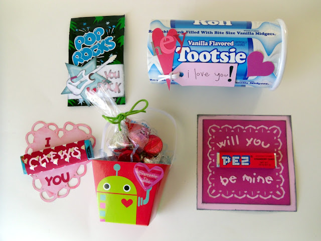 Here's a close up of the Pop Rocks valentine. I have been using my Cricut to cut out a lot of the shapes, and trying to make good use of my stash of stickers and rub ons. I hope the kids like them, and even if they don't "get" the sentiment- I know they'll LOVE the candy. :)